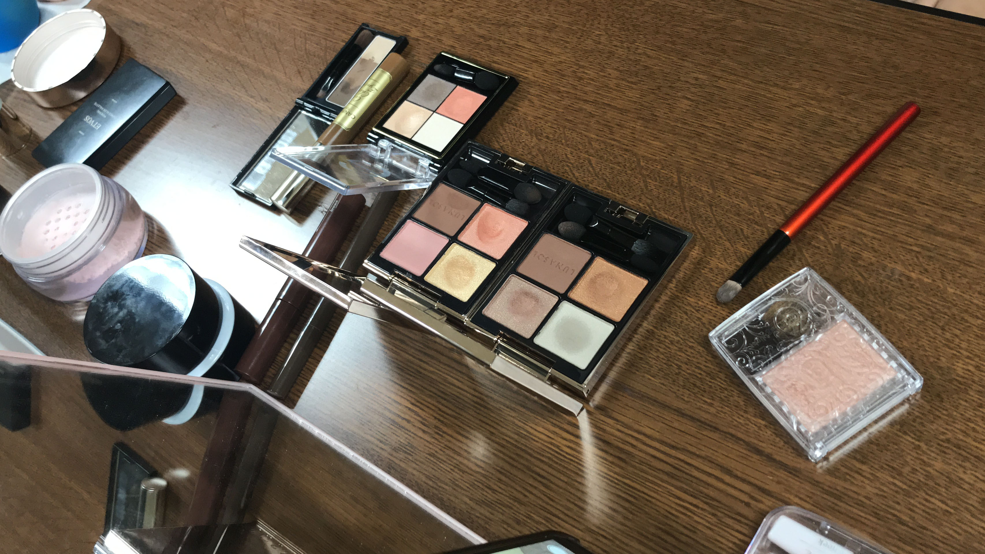 「市川さんには、やわらかい色が似あいそうですね。濃い色を使うと古い感じになっちゃうので」という高村さんが手にしたのは、オレンジ系のアイシャドーパレット。まぶた全体に明るいクリーム色のせ、アイホールにオレンジ色、そして目の際に茶色を重ねていくと、明るくて健康的な印象の目元が完成しました。
