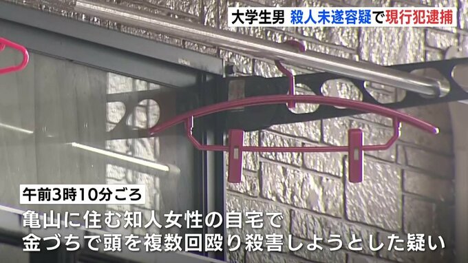 2日未明、広島市の住宅で、女性の頭を金づちで複数回殴って殺害しようとしたとして、自称、大学生の男(22)が殺人未遂の疑いで現行犯逮捕されました。