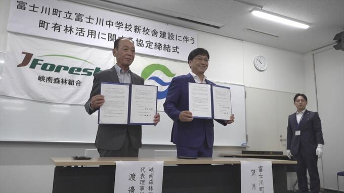 2025年開校する富士川中学校の新校舎に、地元産の木材を活用する協定を山梨県富士川町と地元の森林組合が結びました。